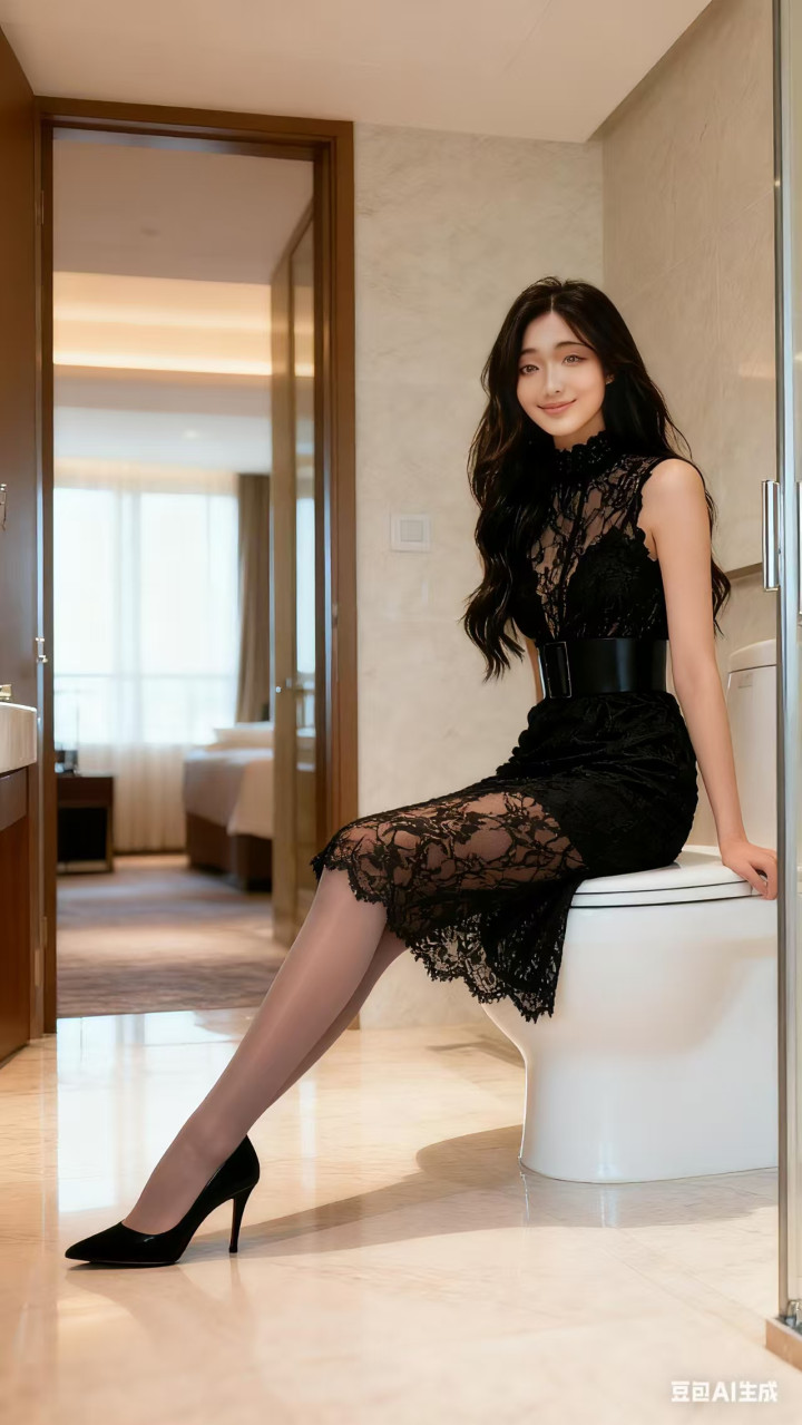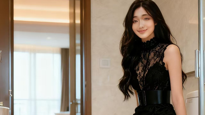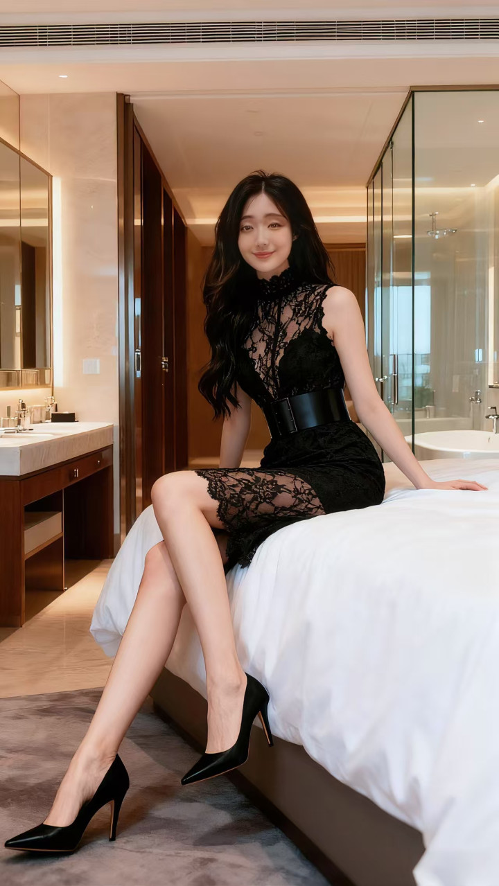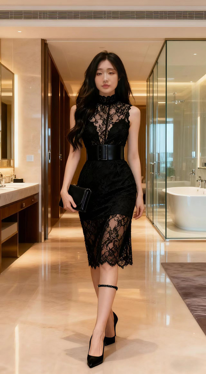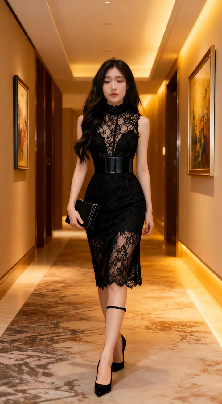 黑色蕾丝无袖连衣裙,高领与镂空设计交织出性感与优雅的平衡,腰间搭配宽版黑色皮带,进一步凸显腰线。裙摆处的蕾丝透视设计增添了层次感,脚踩黑色尖头高跟鞋,脚踝处的黑色链条装饰细节感十足,整体造型在走廊的暖光映衬下,尽显成熟妩媚的御姐风范。